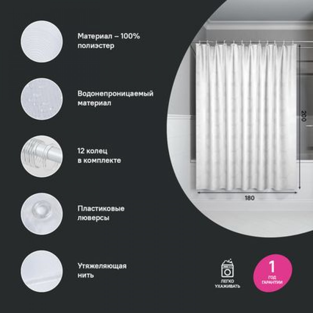 • Легко ухаживать: шторку для ванной комнаты можно стирать в стиральной машине в деликатном режиме и гладить утюгом на минимальной температуре.