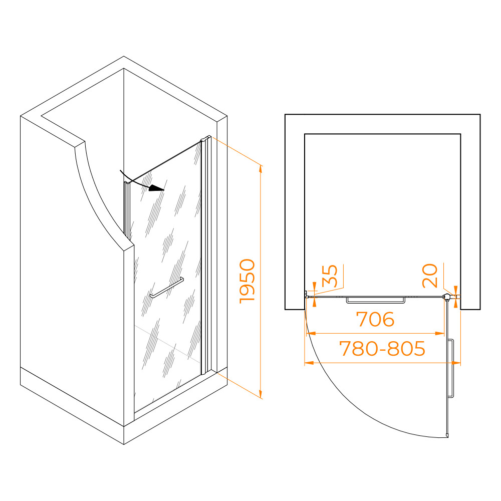 Душевая дверь распашная с маятниковой петлей (открытие только наружу)