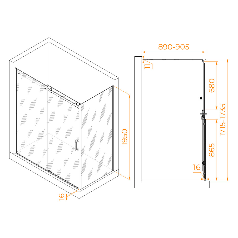 Модель состоит из двух элементов: дверцы и фиксированной стенки, которые имеют толщину стекла в 8 мм.