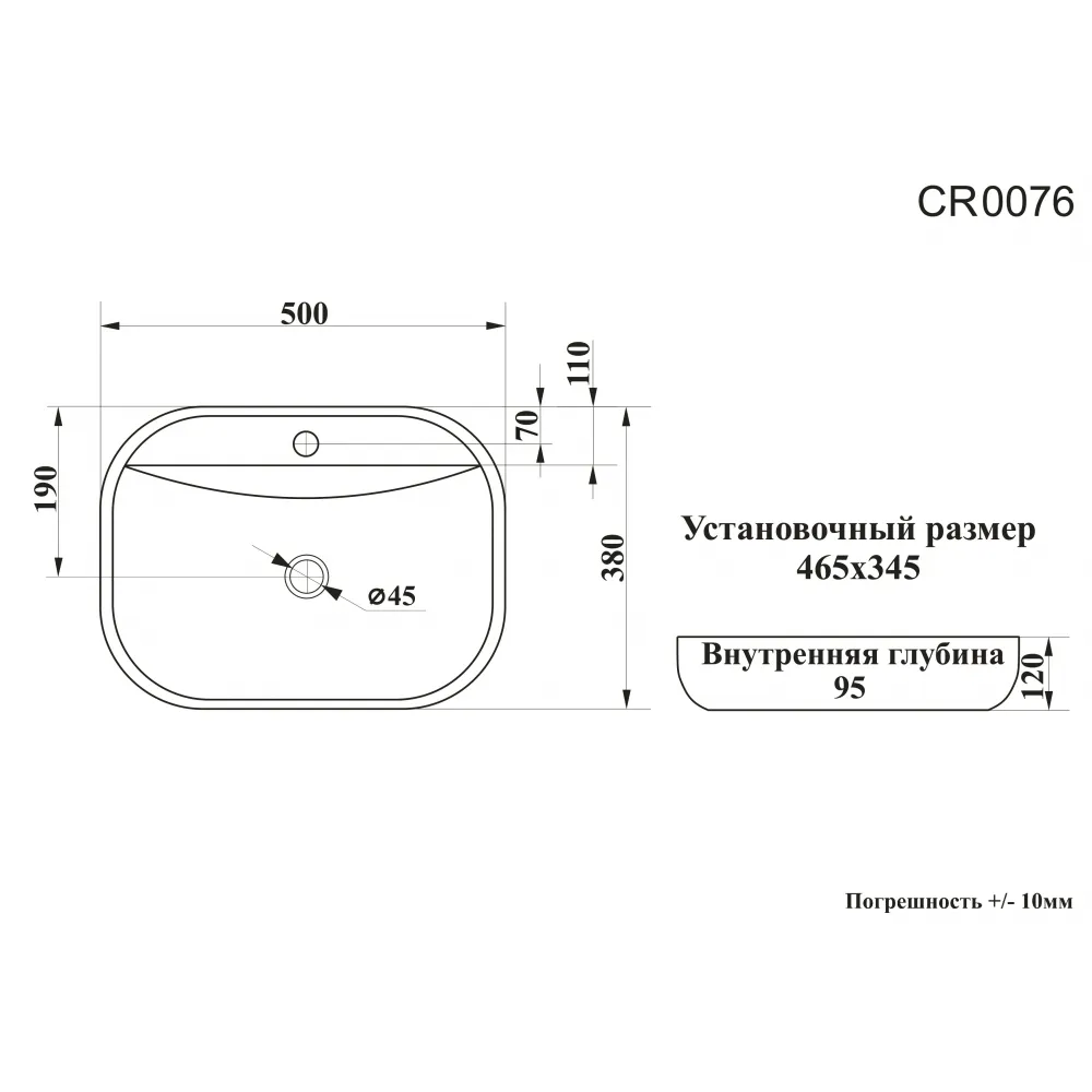 Технические характеристики Раковина CR0076 накладная, белая, овальная, с отверстием под смеситель 500х380х120 Ceruttispa
