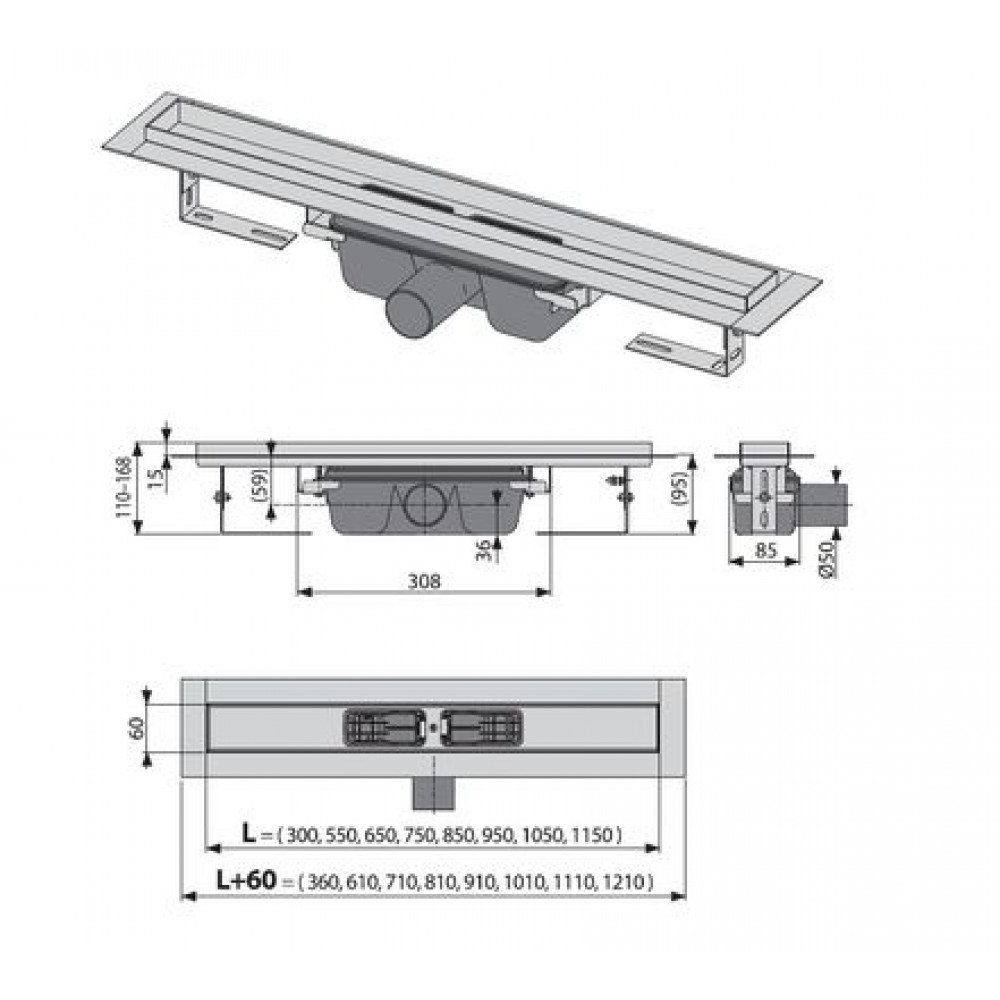 Технические характеристики Душевой лоток Alcadrain Professional с порогами для цельной решетки, с горизонтальным сливом (сталь) (APZ6-1150)