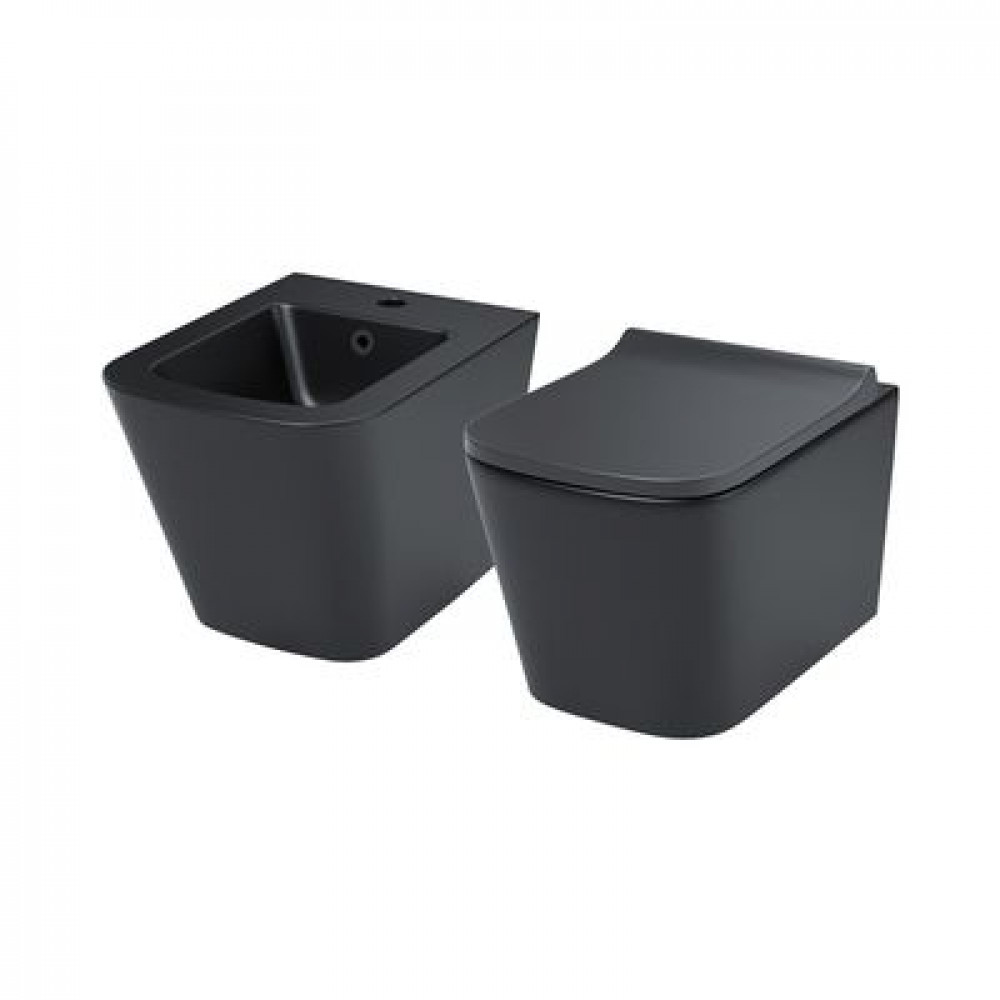 Комплект подвесной керамики Bild в трендовом матовом черном цвете: унитаз и биде в минималистичном дизайне с прямоугольными гранями