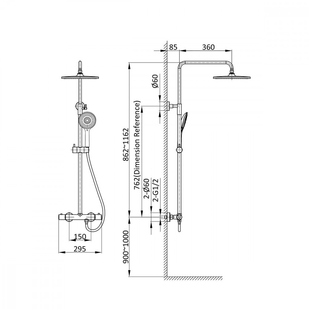 Технические характеристики Душевая стойка термостатическая без излива, верхний душ 25 см, хром, Esse VSFS-1E0TCH