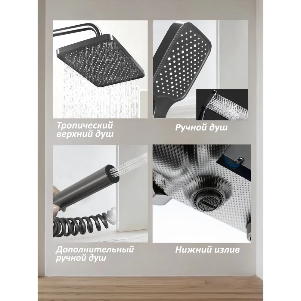 В комплект входят верхний душ, ручной душ со спиралевидным шлангом, держатель для ручной лейки, ручная лейка с гибким шлангом, верхний душ, душевая штанга, кронштейн для верхнего душа, смеситель, отражатели.