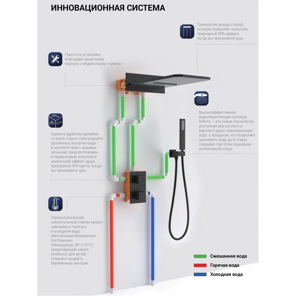 | Комплектация | Верхний душ, ручной душ, смеситель со встраиваемой частью |